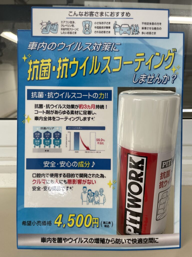 new!なアイテムが登場しました°˖✧ コロナウイルスはもちろん、風邪やインフルエンザなどで ウイルス対策が必須の今にピッタリなアイテムです(*’▽’) 手の消毒は日常になっておりますが… 車内にもウイルスコーティングはいかがですか? 気になる方は是非~♪