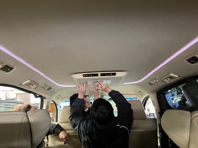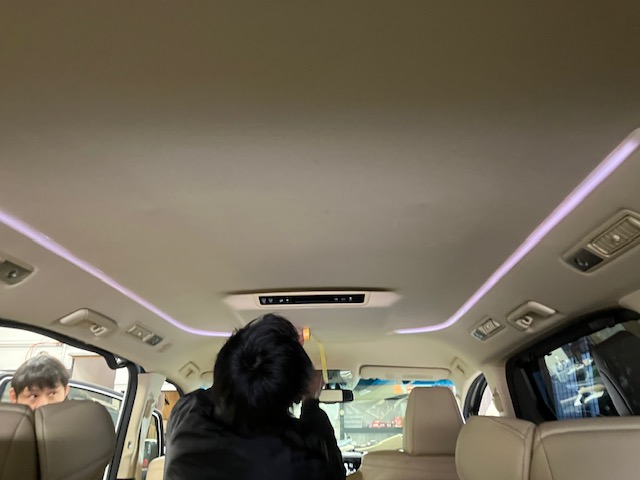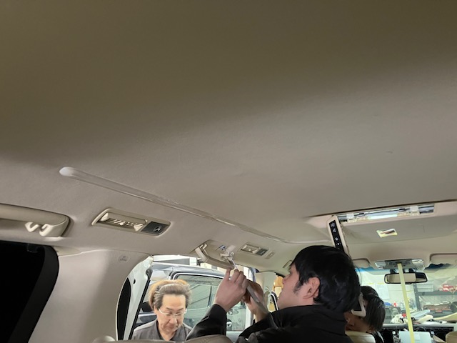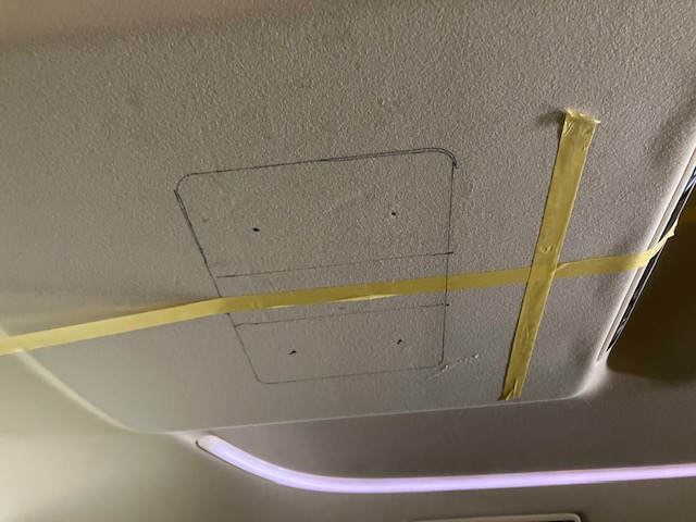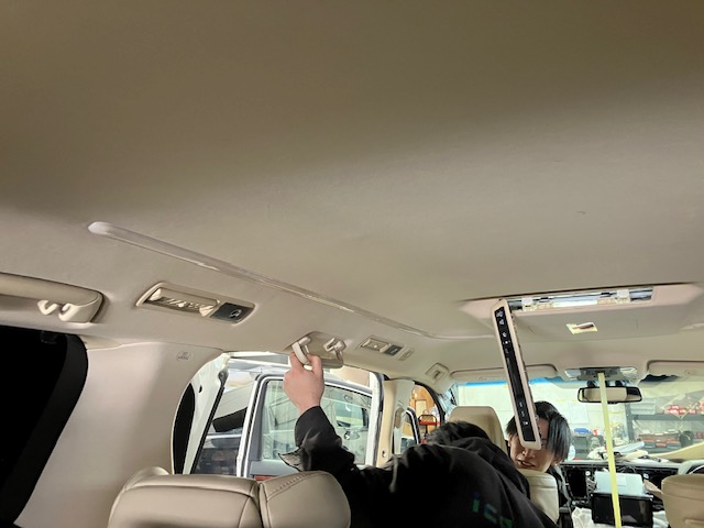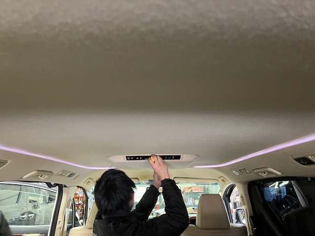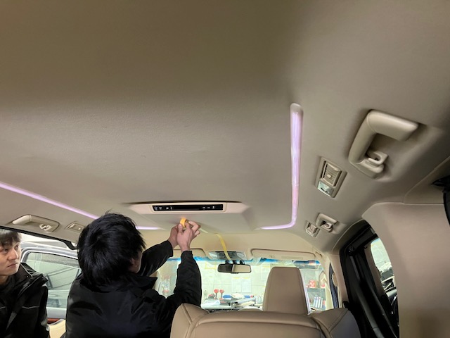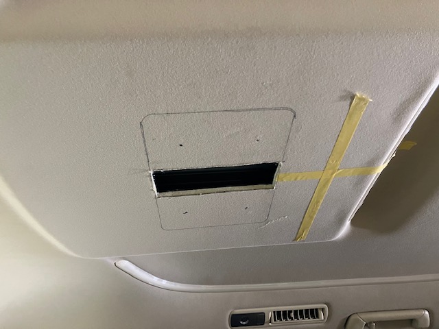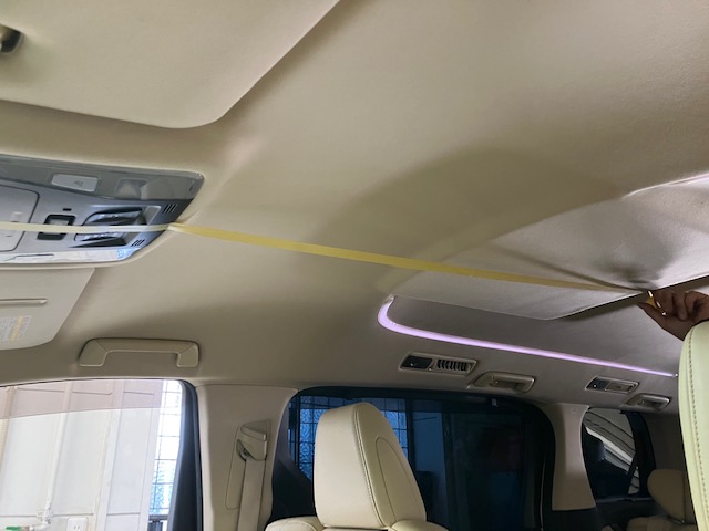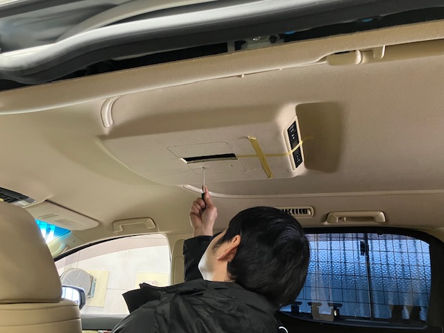 フリップダウンモニターの取付をするのに、中央を明確にしていきます