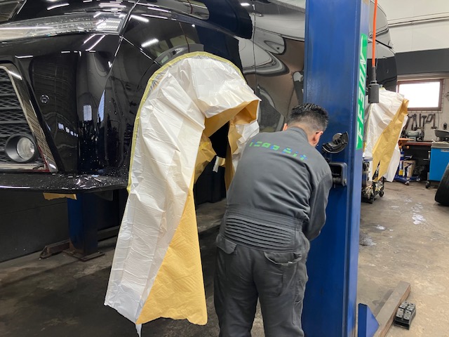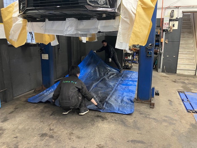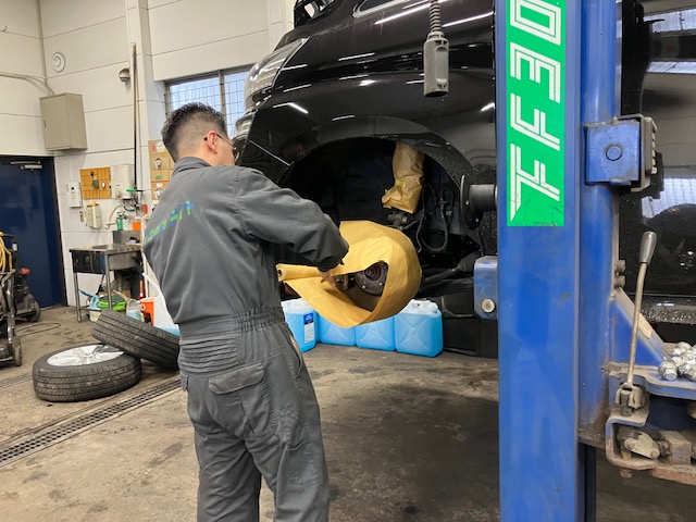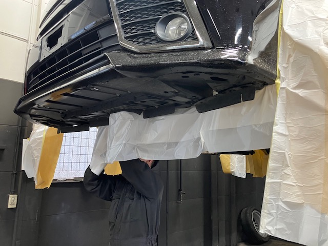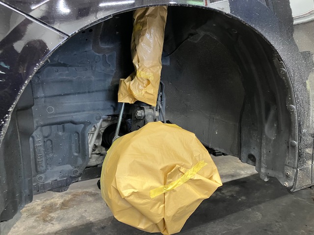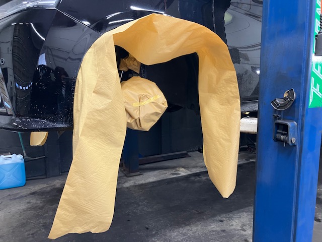 タイヤハウス内から養生紙を貼って