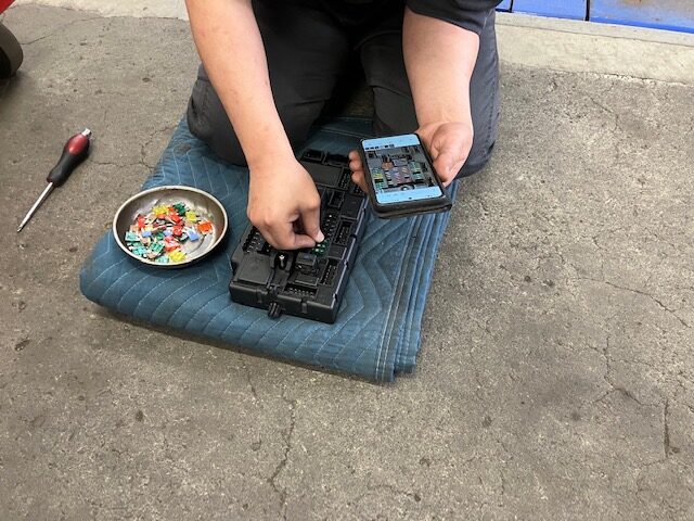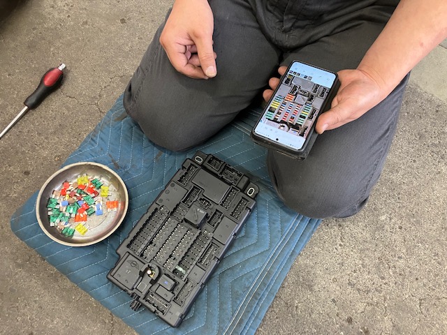 外す前の写真を見ながらカラフルなヒューズを戻していく作業中でした