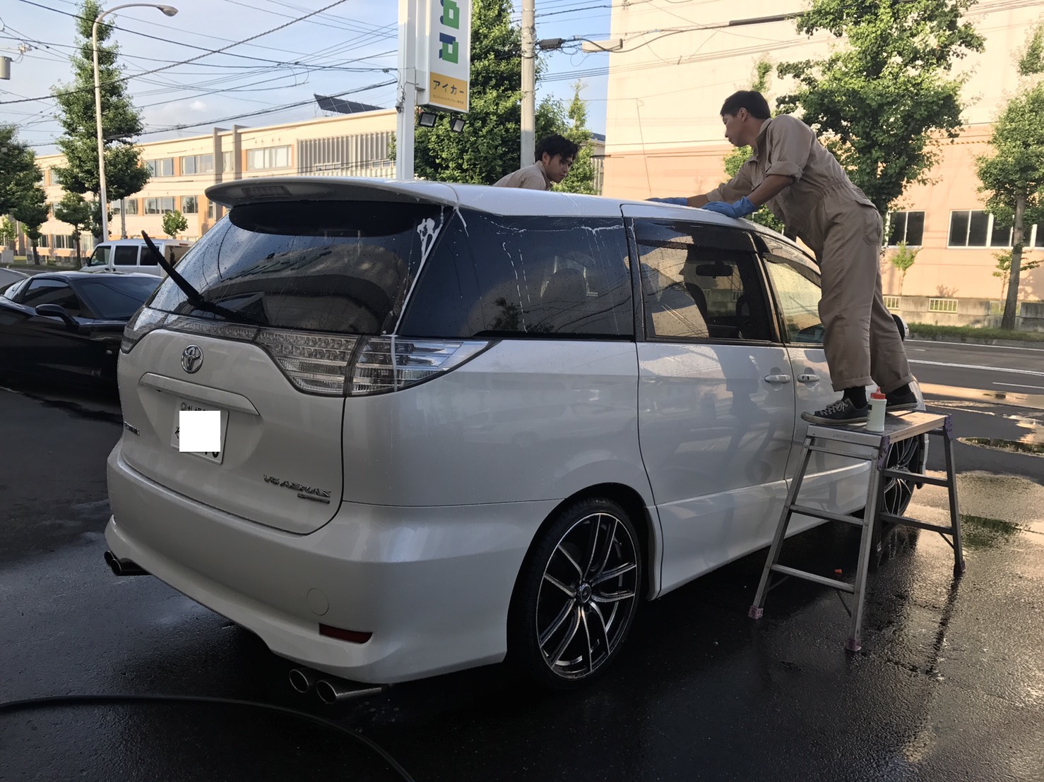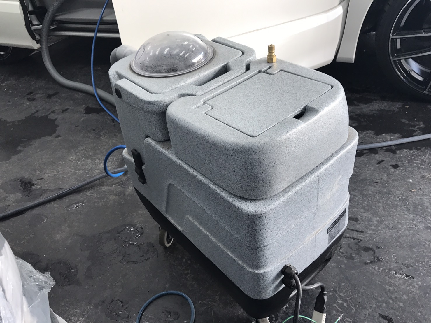 ボディー表面の古いワックスなどを除去する液剤が強烈に床を真っ白にするので