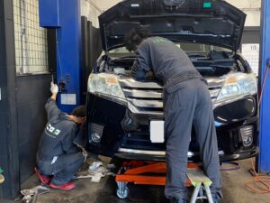 齋藤さんはエンジンを元通りに固定するためエンジンルームからの作業。