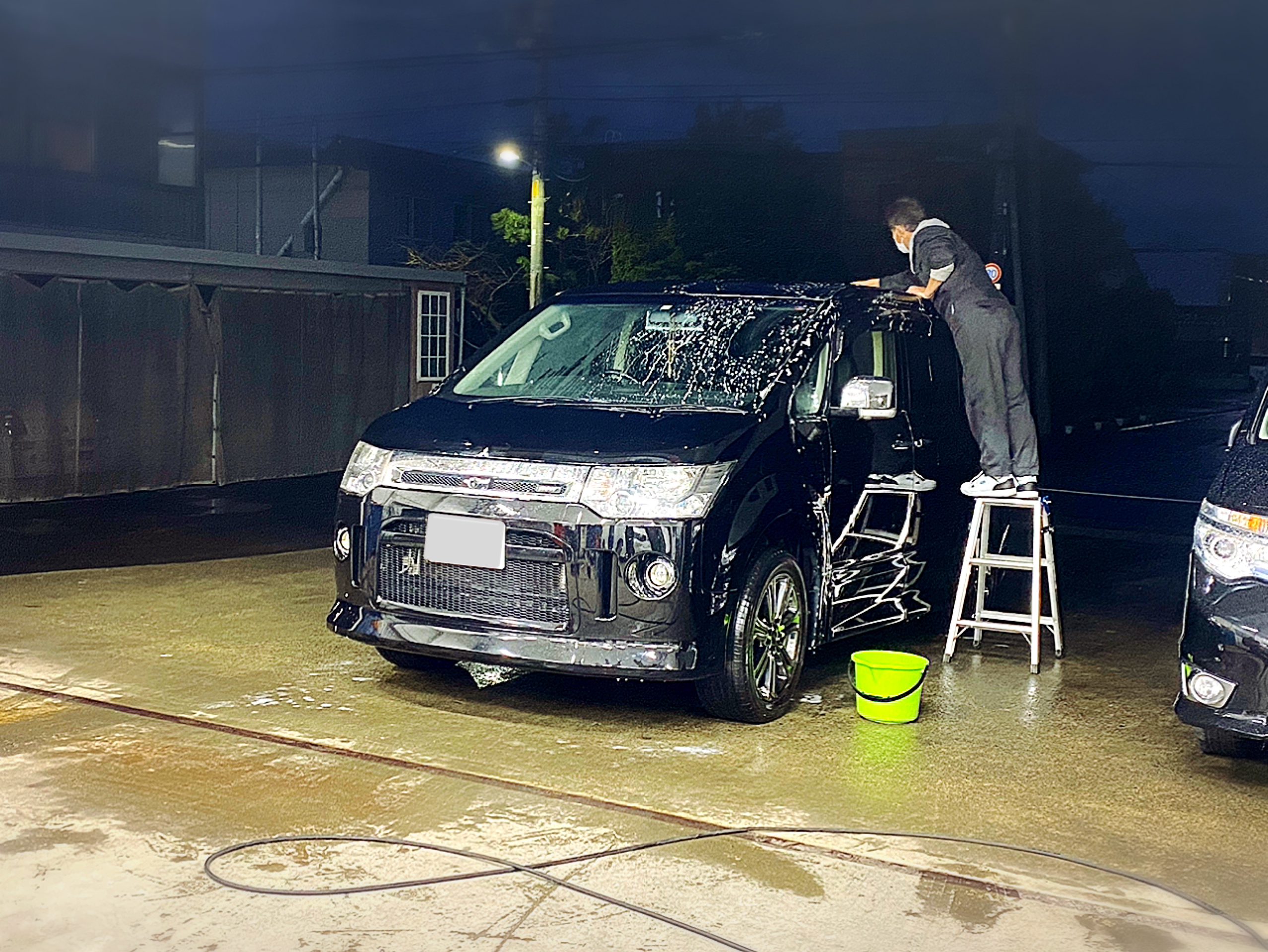 ボディーだけでなくタイヤハウス内の砂や泥汚れも落としたり、背の高いミニバンでは届きづらいルーフも脚立を使ってしっかり洗います!