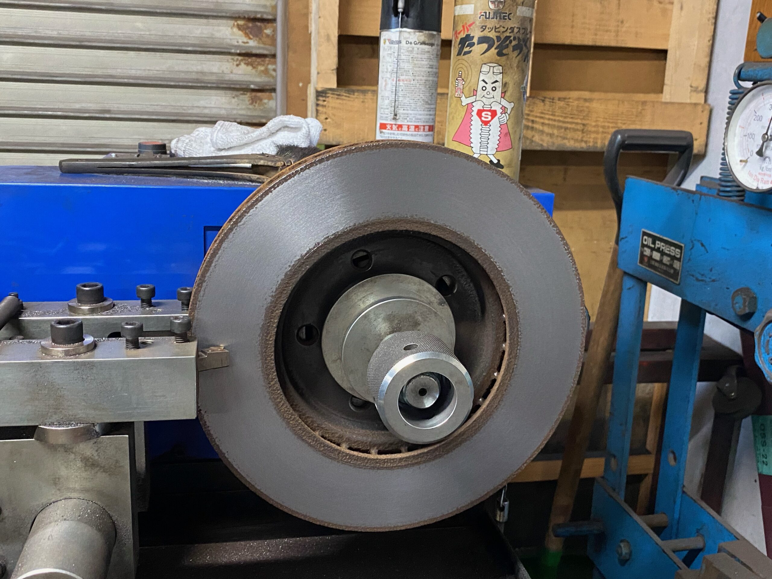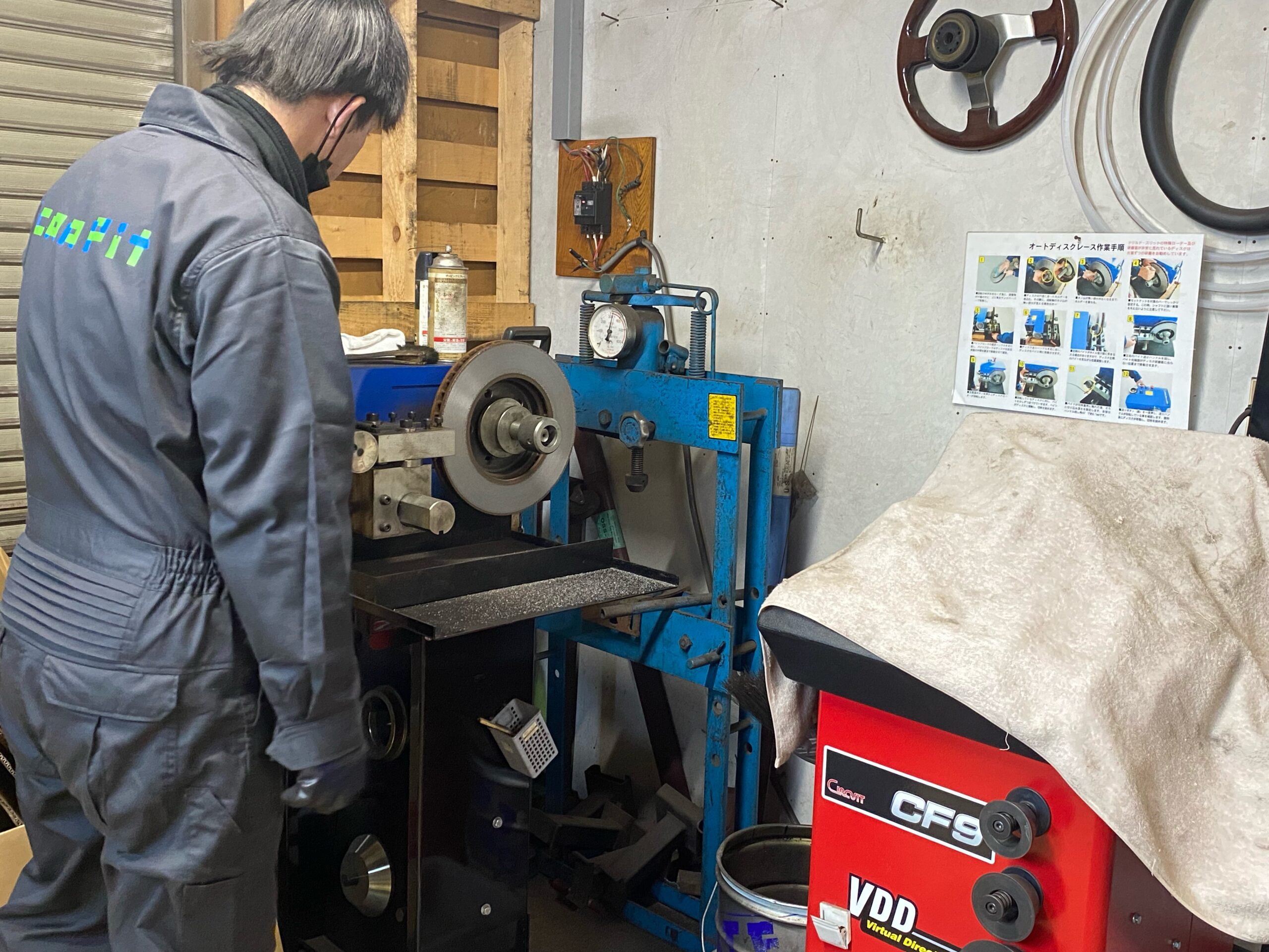 吉田さんがブレーキローターを研磨中です