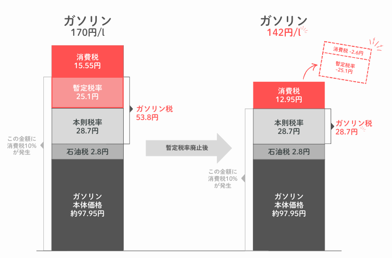 - 暫定税率はガソリンに25.1円/L上乗せされている税金。