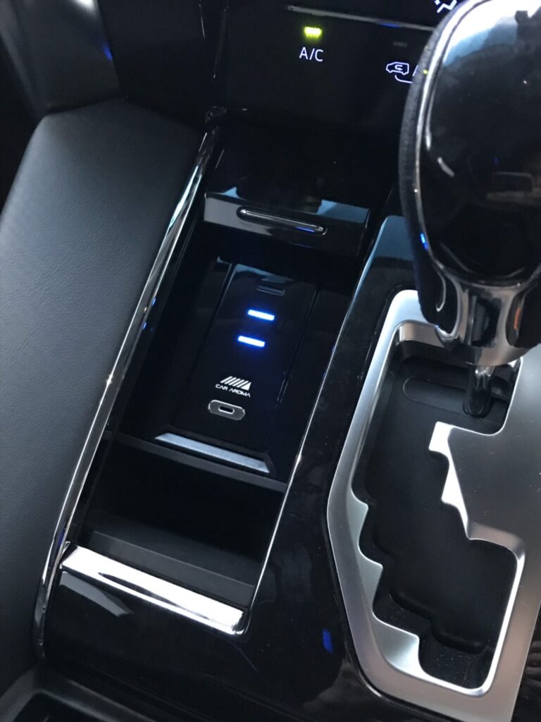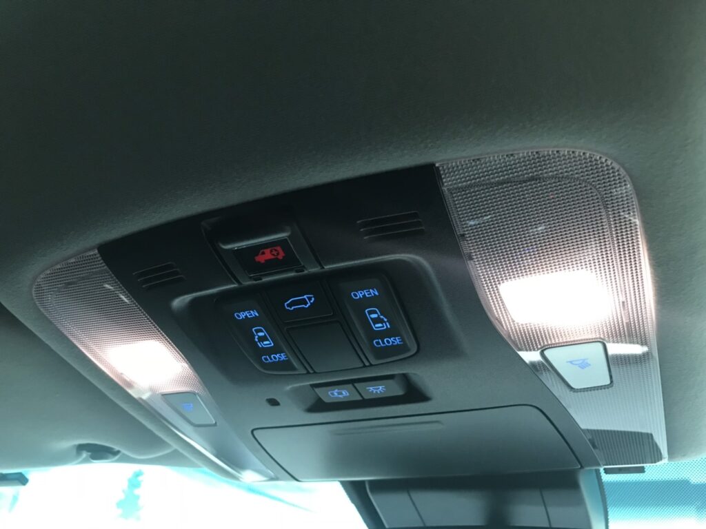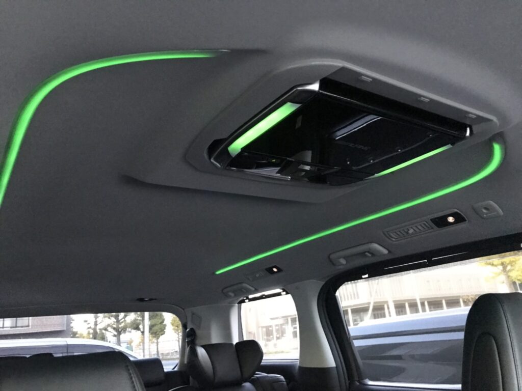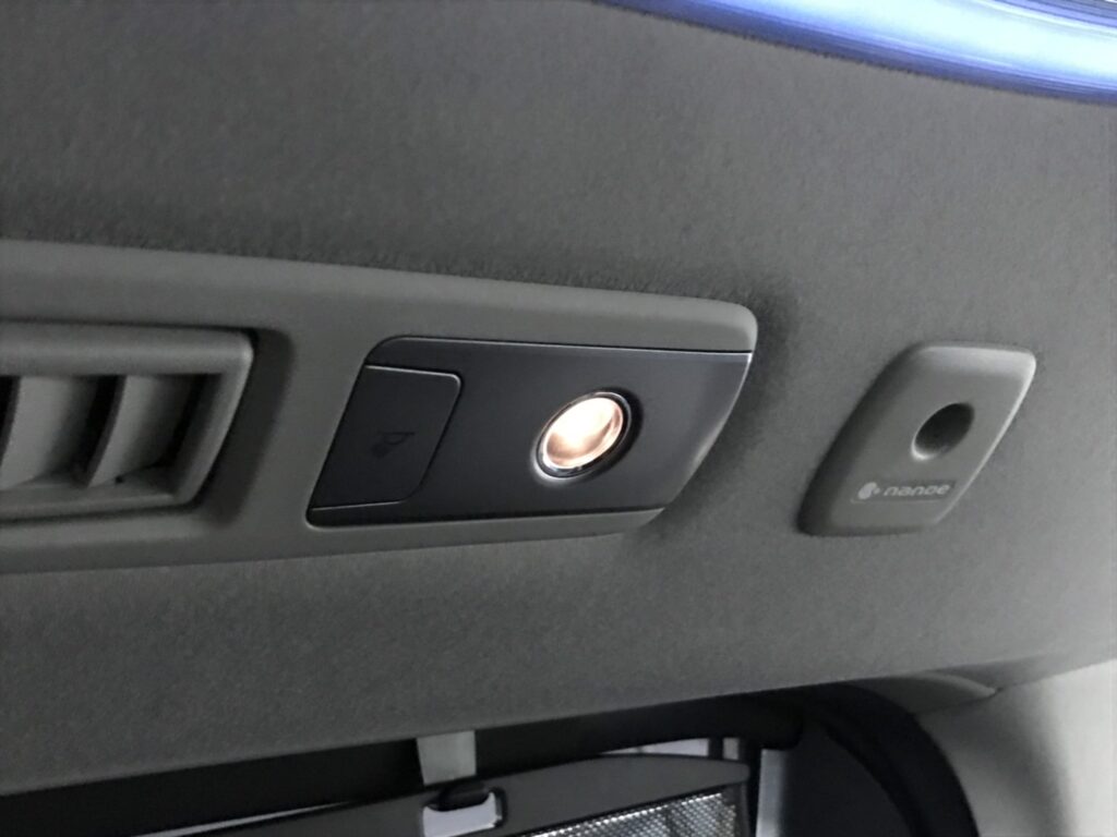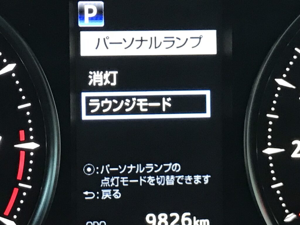 天井に配置されたこの間接照明がモワッと優しく車内を照らし、まさにラウンジっぽくなるのです。このモワッと加減が実に絶妙で、何も無いと夜真っ暗になる車内をいい感じに照らし、後部座席に座る子供達の様子確認も容易となるわけです。(大体寝ていますが)ビバ!ラウンジモードなのです。