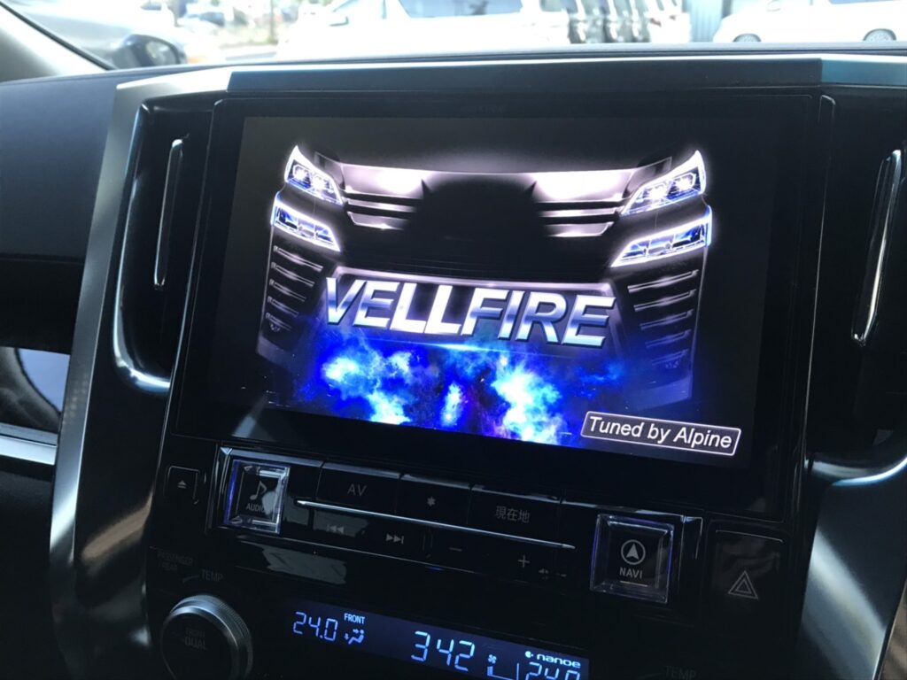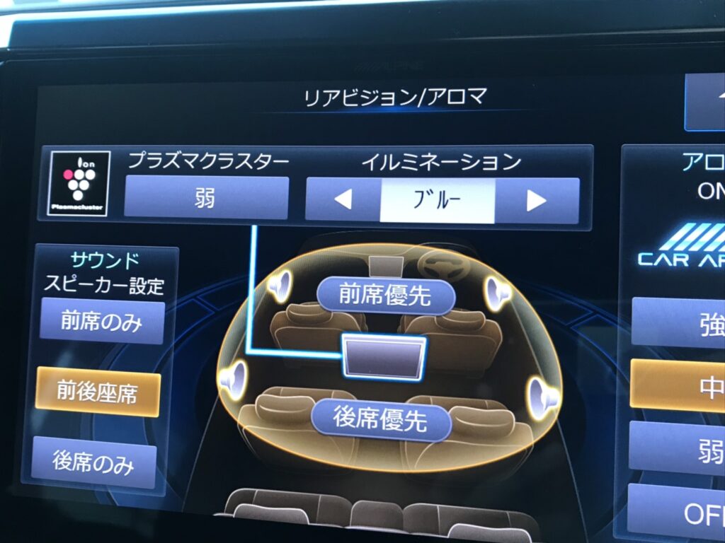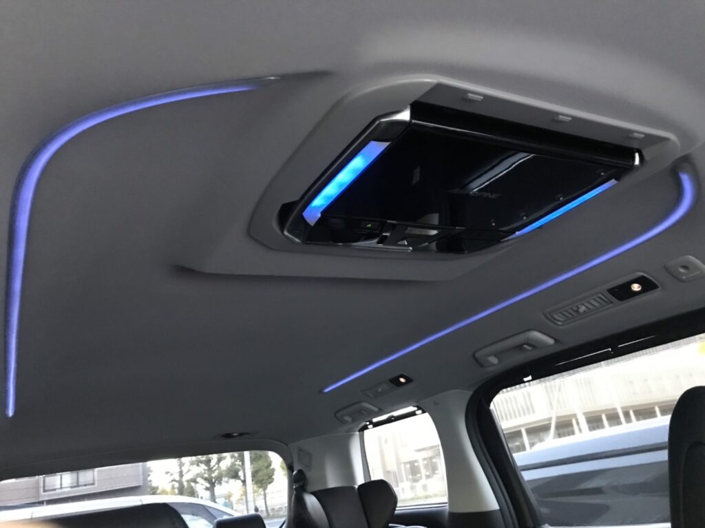 で リアはもちろん前席とセットでアルパインモニターを装備です。前後共に大画面・高画質でいい感じです。なによりJBLサウンド(メーカーオプションで、いろいろ抱き合わせ装備で約100万円也)よりグッとお安いですしね。