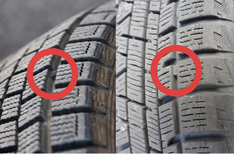 特に冬用タイヤは柔軟性が雪上、氷上での制動性にも影響するため、より厳しい目でチェックしてください。3年を目途に交換を想定した点検を行いましょう。