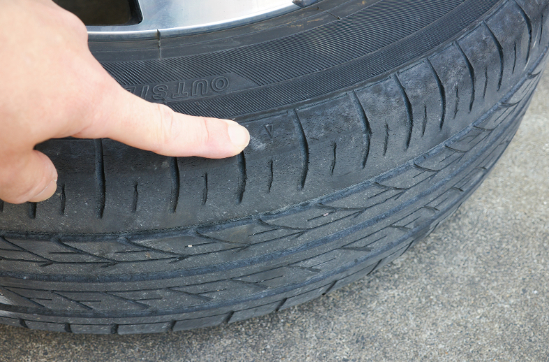 タイヤの側面(サイドウォール)に亀裂やひび割れがあると、タイヤの強度が低下し、バースト(破裂)のリスクが高くなるため、交換が必要です。