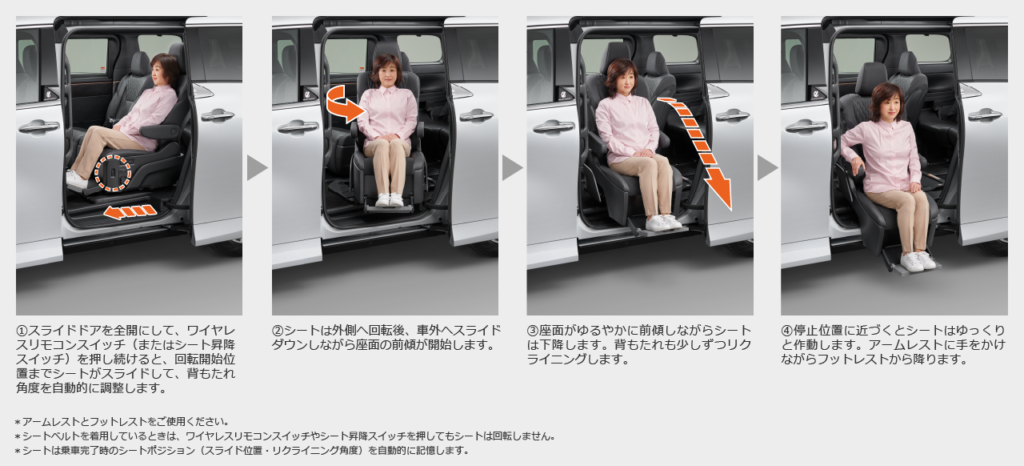 サイドリフトアップチルトシートとは、電動でシートが回転して車外へスライドダウン&伸縮して立ち上がりや着座をサポートするシートです。足腰の弱い方を対象とした福祉(介護)車両といえばイメージがしやすいと思います。