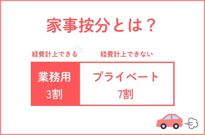 車についても光熱費などと同様、この家事按分が認められています。そのため、仕事用の車を日常的にプライベートで使用すること自体は問題ありませんが、どの程度プライベートで使用したかの把握はしておきましょう。(計算方法等は後述します)