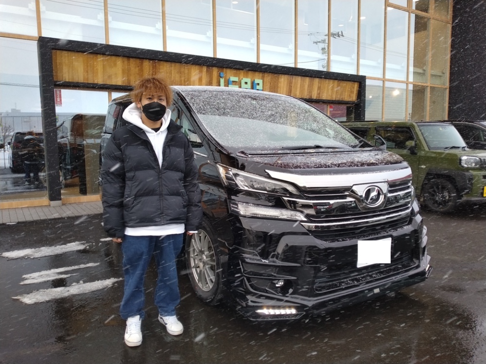 登別市 F様 トヨタ ヴェルファイアZ Gエディション この度は数ある中古車販売店の中から当店にてお任せいただき誠にありがとうございました! 本日、ご納車となりました!! あいにくの悪天候の中でのご納車となってしまいましたが、ご契約いただいてからちょうど2週間でのご納車で予定通り進み良かったです♪ ご納車時もずっと「カッコイイ〜」を連発し、大変喜んで頂き僕も嬉しい限りでございます!! これからの雪道、エアロの破損にはくれぐれもお気を付け下さいね!! 新しいヴェルファイアでご家族共々素敵なカーライフをお送りください! 今後とも末永いお付き合いの程、宜しくお願い致します。 F様 この度は誠にありがとうございました。