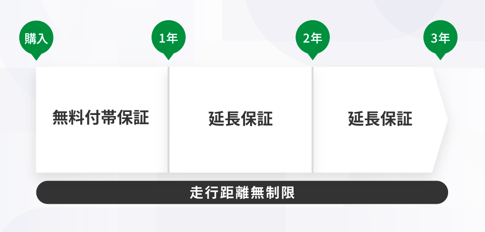 保証期間は最長3年間、保証期間内であれば走行距離無制限で保証サービスをご利用いただけます。