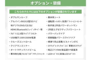 ★ダブルサンルーフ★アルパインBIG X10型SDナビ(地デジフルセグTV/DVD/CD/Bluetooth/ミュージックサーバー/HDMI/USB/後席個別再生機能など)★アルパイン12.8型フリップダウンモニター★クルーズコントロール★クリアランスソナー★ワンタッチスイッチ付き両側電動パワースライドドア★電動パワーバックドア★ブラックレザーシート★前席パワーシート/シートヒーター★運転席メモリーシート★助手席パワーオットマン★後席エグゼクティブパワーシート★ステアリングヒーター★プッシュスタート★スマートキー★USB端子★100V1500W電源★ビルトインETC★寒冷地仕様★フロントガラスデアイサー/ドアミラーヒーター/リヤLEDフォグライト★電子パーキングブレーキ★ブレーキホールド★横滑り防止装置★純正17インチアルミホイール★新品夏タイヤ装着済★オートマチックハイビームシステム★LEDヘッドライト★オートライト★LED前後フォグライト★LEDデイライト★LEDウィンカーミラー★LEDコンビテール★各種LED★