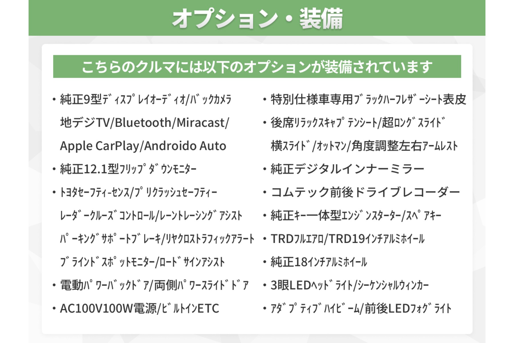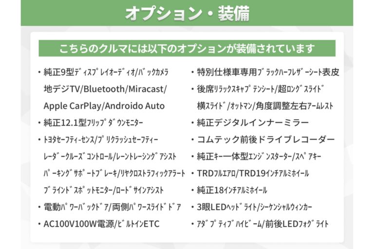 ★ツインムーンルーフ★TRDフルエアロ(LEDライト付)★TRD19インチAW★純正9型ディスプレイオーディオ(ナビ/地デジフルセグ/CD/DVD/USB/Bluetooth/Miracastなど)★純正12.1型後席フリップダウンモニター★トヨタセーフティセンス★レーダークルーズコントロール★プリクラッシュセーフティ★オートマチックハイビーム★レーントレーシングアシスト★ブラインドスポットモニター★パーキングサポートブレーキ★リアクロストラフィックアラート★ロードサインアシスト★両側電動パワースライドドア★電動パワーバックドア★専用ハーフレザーシート★2列目席ロングスライド/オットマン★バックカメラ★コーナーセンサー★電動パーキングブレーキ★オートブレーキホールド★AC100V/1500W電源コンセント★ビルトインETC2.0★コムテック前後ドライブレコーダー★3眼LEDヘッドライト/オートライト★LEDライト各種★他多数!
