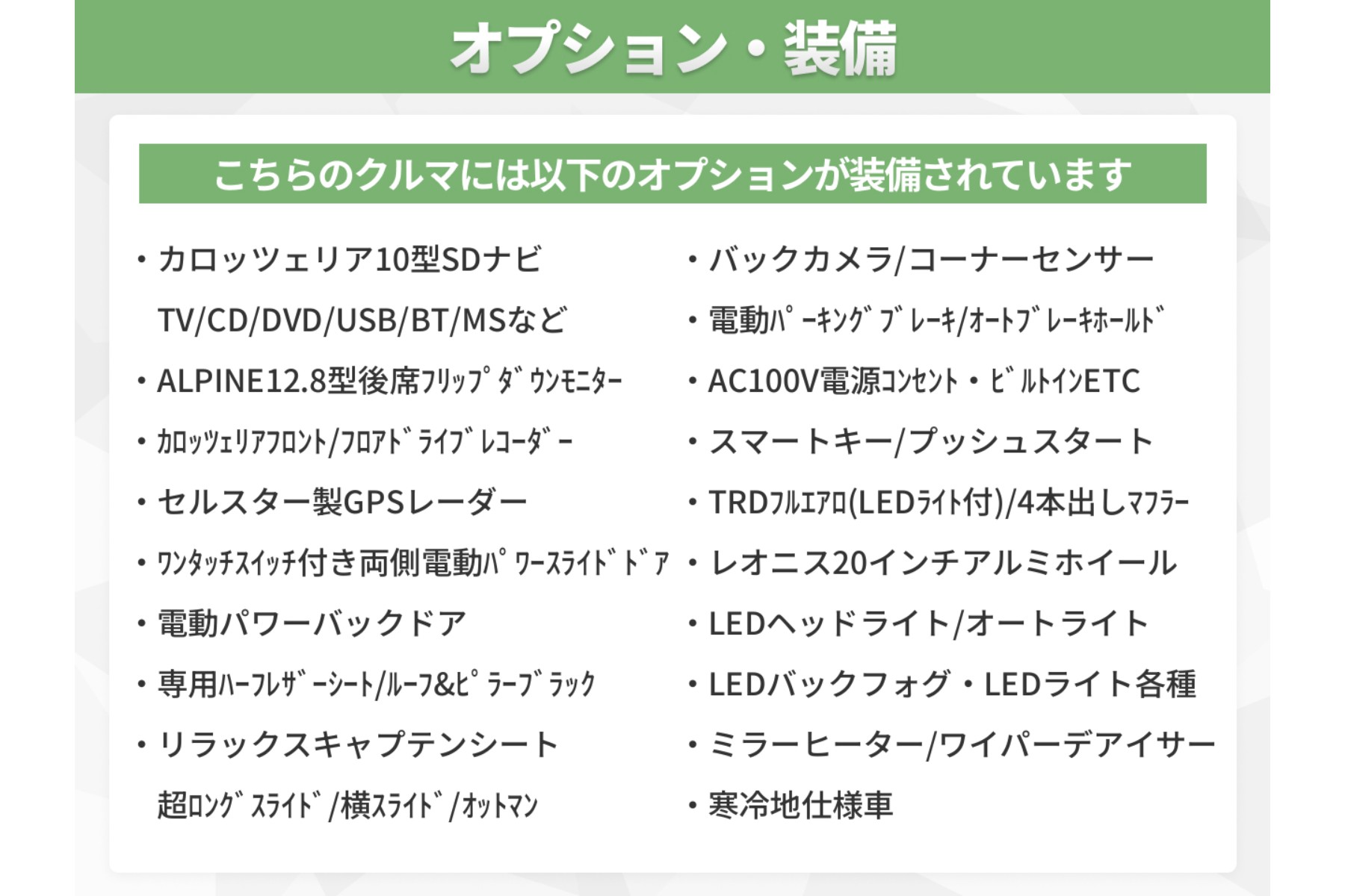 ★カロッツェリア10型SDナビ(地デジフルセグ/CD/DVD/USB/Bluetooth/ミュージックサーバーなど)★アルパイン12.8型後席フリップダウンモニター★カロッツェリアフロント/フロアドライブレコーダー★純正別体型エンジンスターター★ワンタッチスイッチ付両側電動パワースライドドア★電動パワーバックドア★専用ハーフレザーシート★専用ルーフ/ピラーブラック★2列目席ロングスライド/オットマン★バックカメラ★コーナーセンサー★電動パーキングブレーキ★オートブレーキホールド★LEDヘッドライト/オートライト★LEDライト各種★TRDフルエアロ(LEDライト付)★TRD4本出しマフラー★ローダウン★レオニス20インチアルミホイール★LEDバックフォグランプ★ミラーヒーター★ワイパーデアイサー★寒冷地仕様車★他多数!