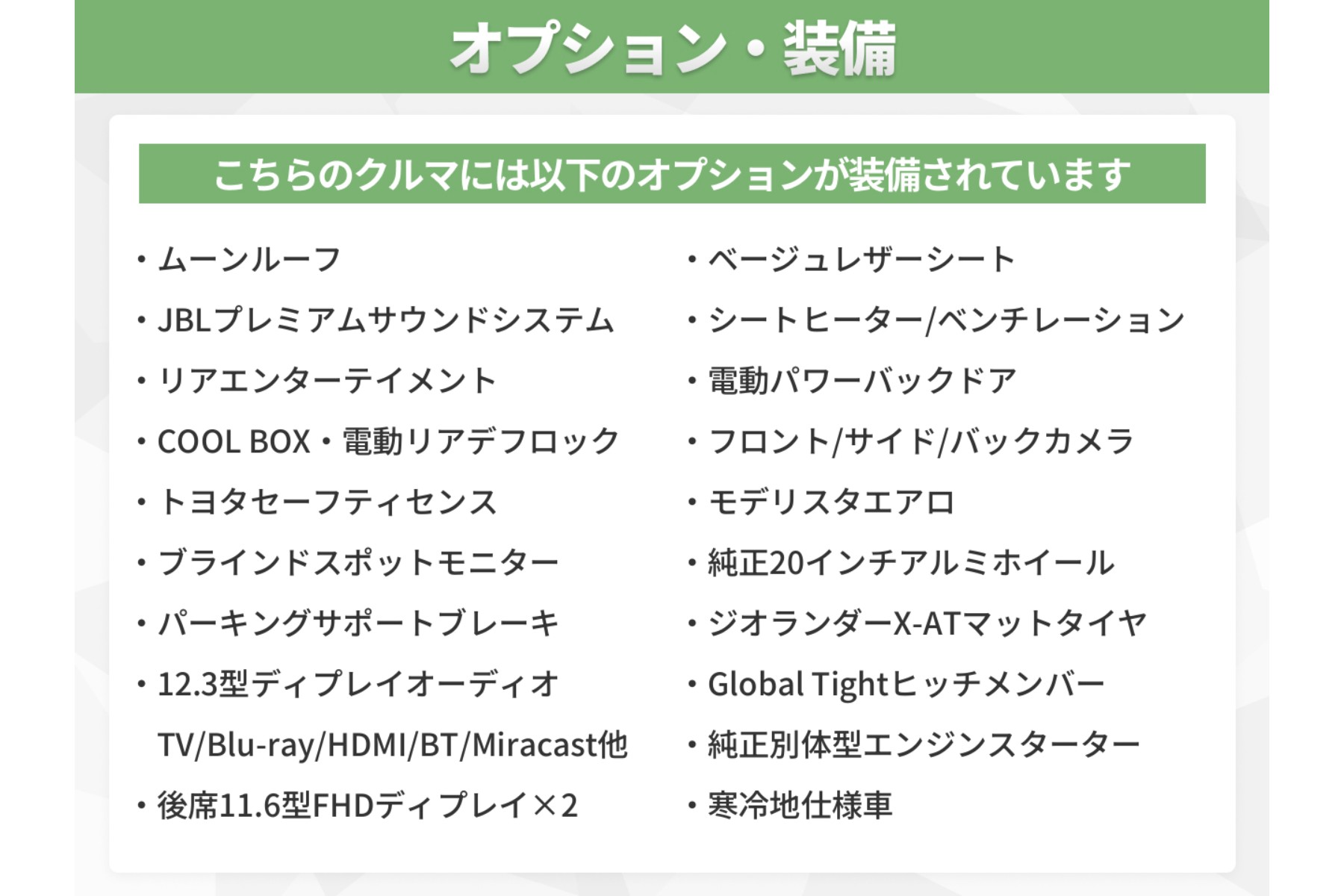 ★ムーンルーフ★JBLプレミアムサウンドシステム★リアエンターテイメント★パノラミックビューモニター★COOL BOX★電動リアデフロック★トヨタセーフティセンス★レーダークルーズコントロール★プリクラッシュセーフティ★レーントレーシングアシスト★ドライバー異常時対応システム★ロードサインアシスト★アダプティブハイビームシステム★先行者発進告知機能★ブラインドスポットモニター★パーキングサポートブレーキ★VDIM★12.3型ディスプレイオーディオ(地デジフルセグ/CD/DVD/Blu-ray/SD/USB/HDMI/Apple CarPlay/Android Auto/Miracast/Bluetooth/ミュージックサーバーなど)★後席11.6型FHDディスプレイ×2★電動パワーバックドア★ベージュレザーシート★全席シートヒーター/ベンチレーション★フロント/サイド/バックカメラ★コーナーセンサー★電動パーキングブレーキ★オートブレーキホールド★モデリスタエアロ★Global Tightヒッチメンバー★純正20インチアルミホイール★ジオランダーX-ATマットタイヤ★寒冷地仕様車★他多数!