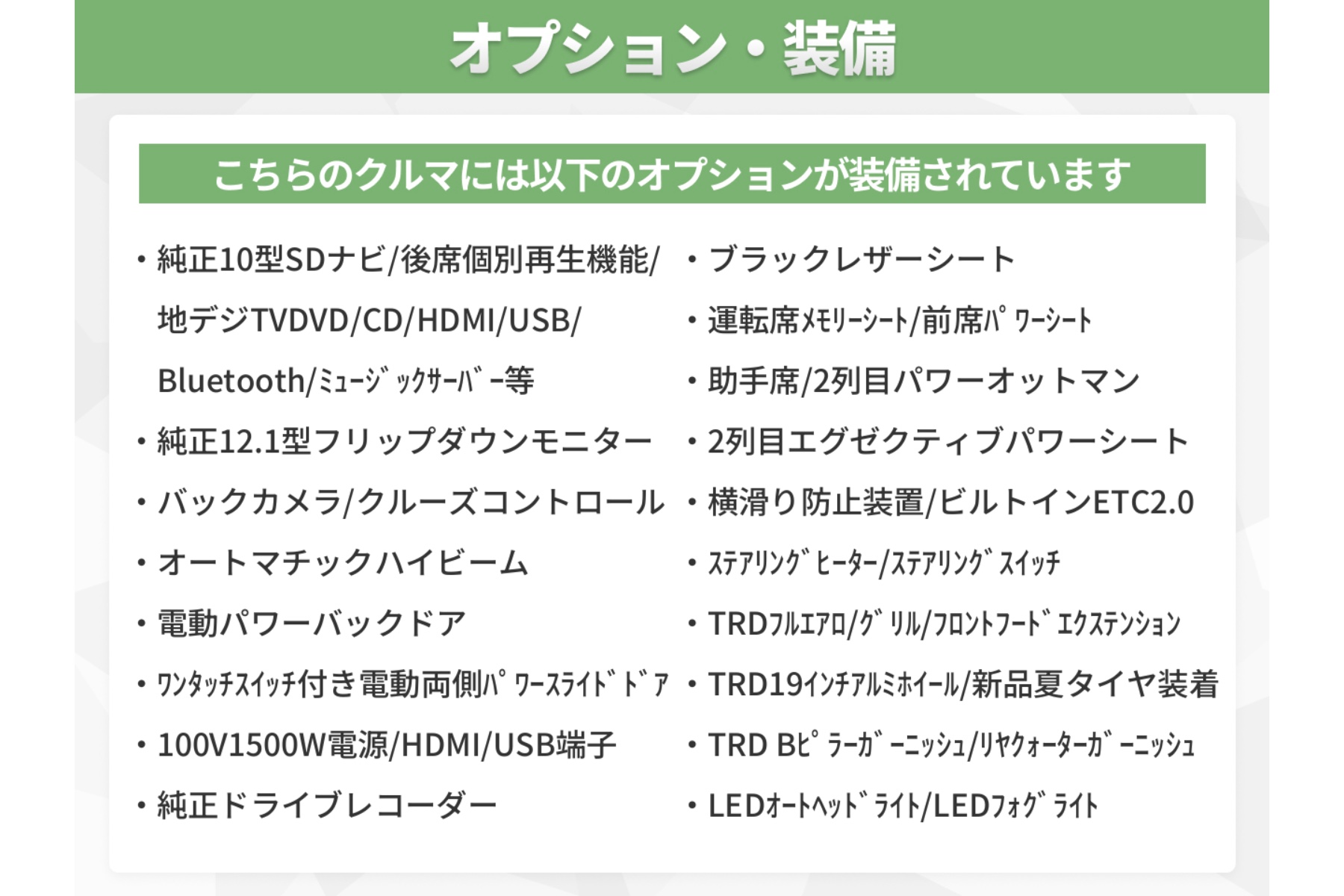 ★ブラックレザーシート★純正10型SDナビ(地デジフルセグ/DVD/CD/SD/Bluetooth/HDMI/USB/FM/AM/ミュージックサーバー/後席個別再生機能など)★純正12.1型フリップダウンモニター★バックカメラ★クルーズコントロール★オートマチックハイビーム★クリアランスソナー★ステアリングスイッチ/ヒーター★電動パーキングブレーキ★電動パワーバックドア★ワンタッチスイッチ付き両側パワースライドドア★前席シートヒーター/パワーシート★運転席メモリーシート★2列目エグゼクティブパワーシート/オットマン★100V1500W電源★HDMI/USB端子★純正ドライブレコーダー★ビルトインETC2.0★プッシュスタート★スマートキー★TRD フルエアロ★TRD フロントフードエクステンション/フロントグリル★TRD Bピラーガーニッシュ/リヤクォーターガーニッシュ★TRD 19インチアルミホイール★新品夏タイヤ装着済み★LEDヘッドライト★LEDフォグライト★各種LED★