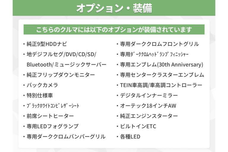 ★純正9型HDDナビ(地デジフルセグ/DVD/CD/SD/Bluetooth/ミュージックサーバーなど)★純正フリップダウンモニター★バックカメラ★特別仕様車★ブラックホワイトコンビレザーシート★前席シートヒーター★専用LEDフォグランプ★専用ダーククロムバンパーグリル★専用ダーククロムフロントグリル★専用ダーククロムヘッドランプフィニッシャー★専用エンブレム(30th Anniversary)★専用センタークラスターエンブレム(30th Anniversary)★TEIN車高調★車高調コントローラー★デジタルインナーミラー★オーテック18インチAW★純正エンジンスターター★ビルトインETC★プッシュスタート★スマートキー★HIDヘッドライト★LEDフォグライト★各種LED★
