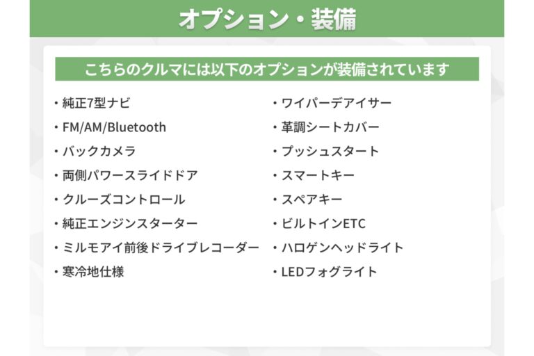 ★純正7型ナビ(FM/AM/Bluetooth)★バックカメラ★両側パワースライドドア★クルーズコントロール★純正エンジンスターター★ミルモアイ前後ドライブレコーダー★寒冷地仕様★ワイパーデアイサー★革調シートカバー★プッシュスタート★スマートキー★スペアキー★ビルトインETC★ハロゲンヘッドライト★LEDフォグライト★各種LED★