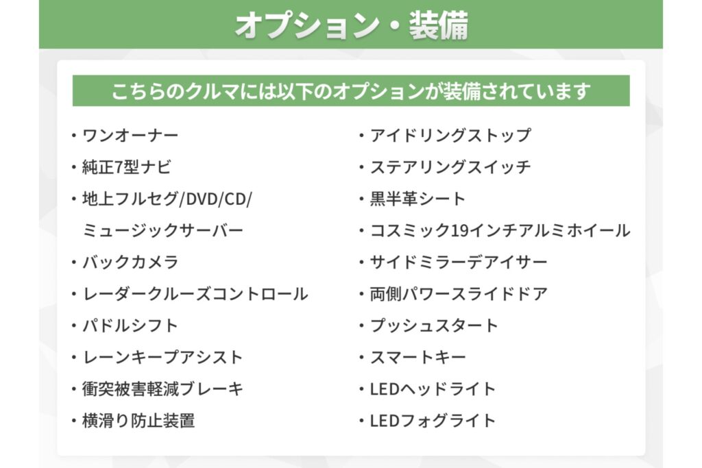 12ヶ月走行距離無制限のアイカー保証を全ての車両にセット。急なトラブルにも安心のロードサービス付き。さらに、多様なニーズに応える様々な保証プランもご用意しています。詳しくはスタッフまでお尋ね下さい。
