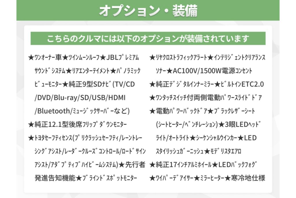 上記の支払総額には「自賠責保険料」「税金(法定費用含む)」「検査登録手続代行費用」「車庫証明手続代行費用」「リサイクル預託金相当額」「アイカー保証 1年間 走行距離無制限」が含まれます。