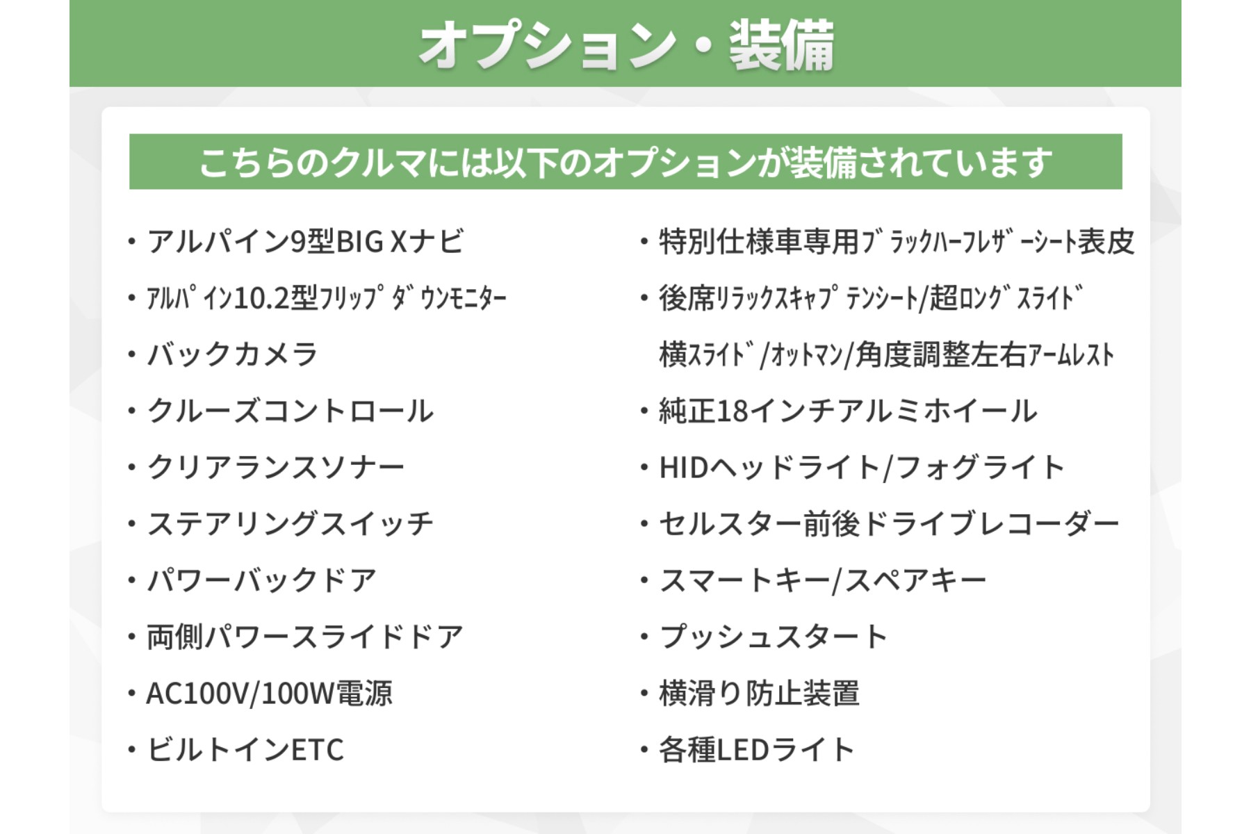 特別仕様車ならではの高級感が随所に際立つ1台!アルパイン9型BIG Xナビや大画面のフリップダウンモニターも装備♪長距離のドライブがより楽しめますね! 上質なカーライフをお求めの方は必見です!